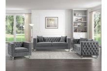 Glamorous from top to bottom, the Orina Collection exemplifies the radiant styling that defines your personal style. From the nailhead accent, gray velvet button-tufted cover, down to the acrylic legs that support the sofa, love seat and chair, each classic accent culminates to achieve the elegant aesthetic you desire for your home’s décor.