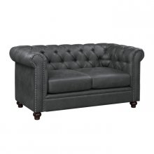 With a design that is rooted in traditional style, the classic look of the Wallstone Collection presents a timeless addition to your living room setting. This Chesterfield style love seat is offered in gray breathable faux leather and features button tufting and a heavily rolled arm that transitions to encompass the entire back of each piece in the collection. The turned bun foot is finished in a traditional cherry completing the classic look of the love seat.