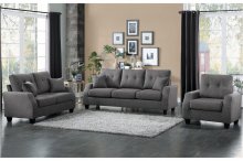 Transitionally styled for placement in a number of home settings, the Vossel Collection is offered in gray fabric with dark finished wood legs for neutral decorative flexibility. The gentle forward slope of the love seat’s contoured track arm paired with the ample button-tufted seat back create a comfortable seating experience, while the reversible seat cushion provides functional convenience. Coordinating sofa and chair are available. The collection is also offered in sand fabric.
