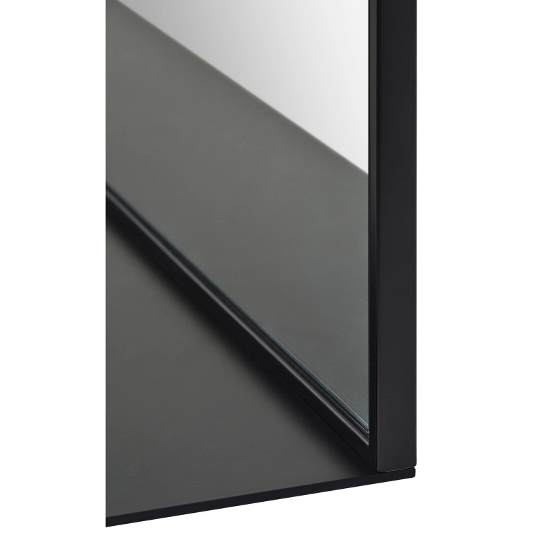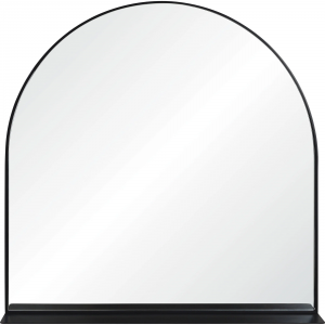 This mirror holds a balance in every regard. Fashion and function come together with a built-in shelf element and powder-coated black frame. A luxe vibe is juxtaposed by retro-inspired curves. Set in the modern entryway it sets the tone for a home that is lively and sophisticated in equal measure. Product Details: