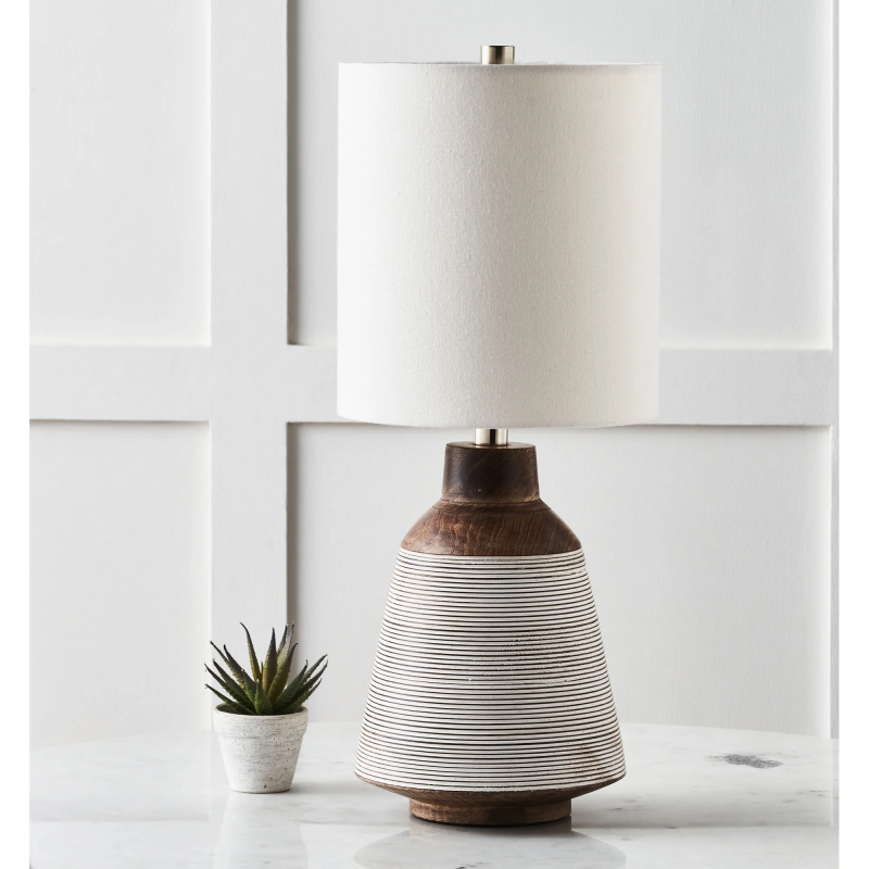 Organic influence takes on a designer appeal through this table lamp design. Set in the bedroom interior, it adds an uplifting quality to mornings and a calming wind-down vibe to evenings. The walnut white wash details on its mango wood construction stand out to complement its off-white cotton shade. Product Details: