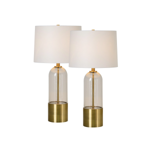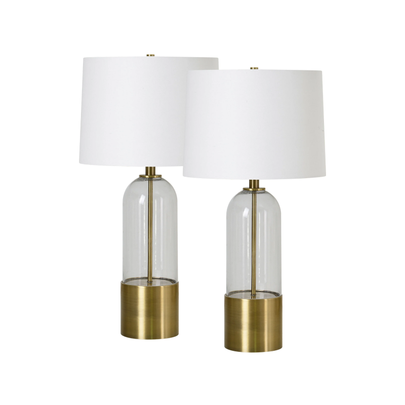 Mid-century modern design takes on a sleek ethereal quality in this set of table lamps. The elements of clear glass, antique brass plated iron and off-white shade form a trifecta of designer proportions. Surrounded by comforting yet elegant decor pieces, this pair elevates the space providing fashion and function. Product Details: