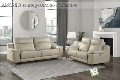 Easing you into plush relaxation, with just the push of a button, is the Antonio Collection. The sleek profile of the ultra-modern design transforms bringing you from your seated position to reclined via the power motion mechanism. The sofa, love seat and chair are supported by chrome finished metal legs and covered in beige top grain leather match upholstery that further lends to the modern styling.
