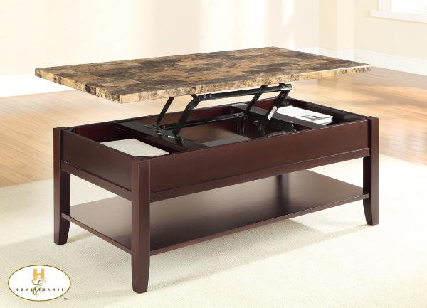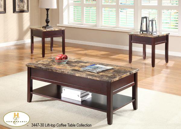 | The Orton Collection. Faux marble tabletops are complimented by a rich cherry finish that covers each top. The cocktail table features display shelf and a convenient lift tabletop that makes this functional group a welcome addition to your home. |