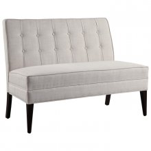 The retro-inspired styling of the Maypop Collection is just what you’re looking for, adding a hint of whimsy to your home. This dual seat settee is covered in beige fabric and plays on the theme of mid-century design to bring a pop of color as well as functionality within your space. Welting, along with pin-tucked button tufting and contrasting wood legs, lend a tailored look to this accent seat. The collection is offered in three additional colors - brown, blue, and teal.