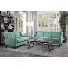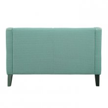 The retro lines of the Roweena Collection serve as a reminder that timeless design never goes out of style. White contrast welting lends definition to the boxy shape of this elegant seating offering. The love seat is covered in a teal fabric, bringing a distinct look to your living room. White fabric-covered buttons punctuate the seat back, further lending to the classic look. Matching chair and sofa are also available along with 3 additional fabric options – dark grey, orange and beige.