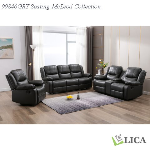 With its ample padding and attention to details, the McLeod reclining sofa collection walks a perfect line between visual attraction and comfort. Thick yet breathable leather gel provides a supple warmth during your relaxation while also achieving long-lasting durability. Contrast piping inset with broad stitching adds some flair, while a neutral grey hue ensures the McLeod collection will harmonize with any décor setting. Generously stuffed cushions join with pillow-style arms to support your body, while double tab-pull latch mechanisms give you the room you need to stretch out and say "ahhhh." With the gentle motion of the rocker recliner and the handy storage console and cupholders of the loveseat, you are all set for leisure.