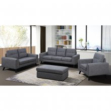 With inspiration taken from Mid-Century Modern styling, the Evelyn sofa collection is a refined addition to any living room. Clean lines and a tailored appearance with piped seams and button-tufted back cushions gives this loveseat an alluring freshness with a hint of retro detailing. Soft chenille upholstery in a neutral grey hue ensures the Evelyn is right at home in any décor setting you can imagine, while exposed angled wooden legs in a black finish completes this contemporary look. Don't forget to coordinate with the matching ottoman - its extra large size not only has plenty of room for you to kick back and stretch out, but it also doubles as a surface to place a cocktail tray for company. Also available in light grey chenille. Also available as a sofa sectional with chaise.