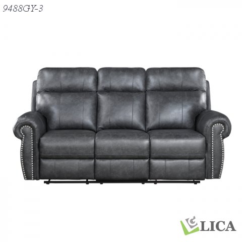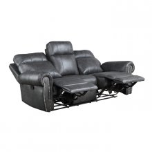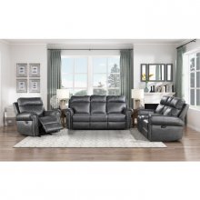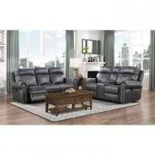 The transitional styling of the Granville Collection pairs classic accent with versatile aesthetics, making the seating group a perfect addition to your home. Offered in gray faux leather fabric, the sofa features dual manual reclining motion mechanisms for easy transition – going from seated to prone with a pull of a side mounted tab. Plush rolled arms, contoured seats and backs lend to your comfortable seating experience, while nailhead accent lends to the timeless look of the Granville Collection.