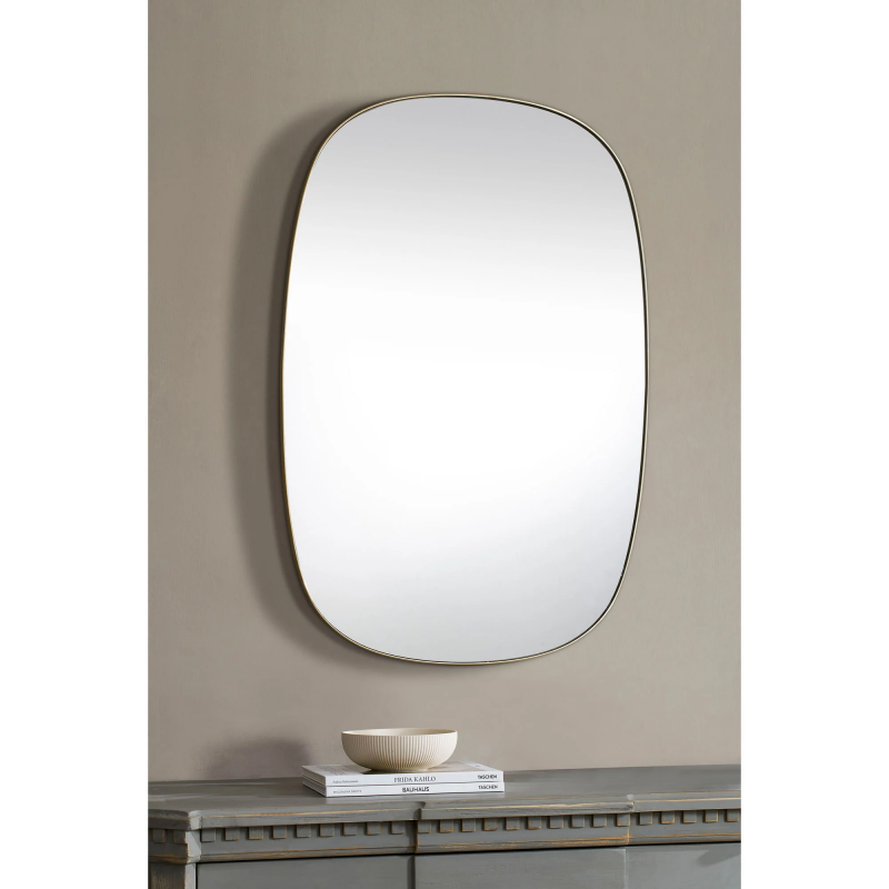 This mirror design saves the spotlight for its surroundings, by showcasing a simple structure with great capacity for reflection. Its brushed brass plated iron frame adds flair to the form, while the oval build brings softness. With a 36- by 24-inch build, it allows for entirely new aesthetic opportunities when set horizontally or vertically. Product Details: