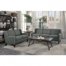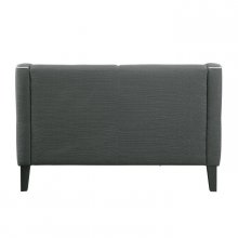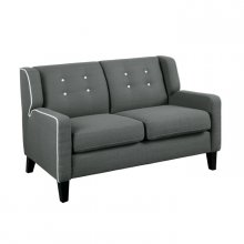 The retro lines of the Roweena Collection serve as a reminder that timeless design never goes out of style. White contrast welting lends definition to the boxy shape of this elegant seating offering. The love seat is covered in a dark grey fabric, bringing a distinct look to your living room. White fabric-covered buttons punctuate the seat back, further lending to the classic look. Matching chair and sofa are also available along with 3 additional fabric options – beige, orange and teal.