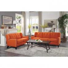 The retro lines of the Roweena Collection serve as a reminder that timeless design never goes out of style. White contrast welting lends definition to the boxy shape of this elegant seating offering. The sofa is covered in an orange fabric, bringing a distinct look to your living room. White fabric-covered buttons punctuate the sofa back further lending to the classic look. Matching love seat and chair are also available along with 3 additional fabric options – dark grey, beige and teal.