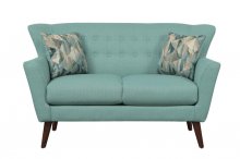 In keeping with the tradition of Mid-Century modern design, the Maja Collection incorporates the classic elements of flared seat backs and legs to create a dramatic profile at home in your living space. Teal neutral-tone fabric that covers the sofa and love seat, complemented by the multi-tone abstract pattern of the chair and toss pillow fabric. Button tufting provides visual and textural depth to the design of the collection.