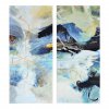 These abstract art paintings invite passersby to create their own story from the twists and turns on each canvas. This set of two works of art can hang vertically or horizontally, together or apart, whatever best suits your client's desire. Best suited for the creative interior, the blue and gold tones in the palette exude a vibrancy that pours out into the room it rests within. Product Details: