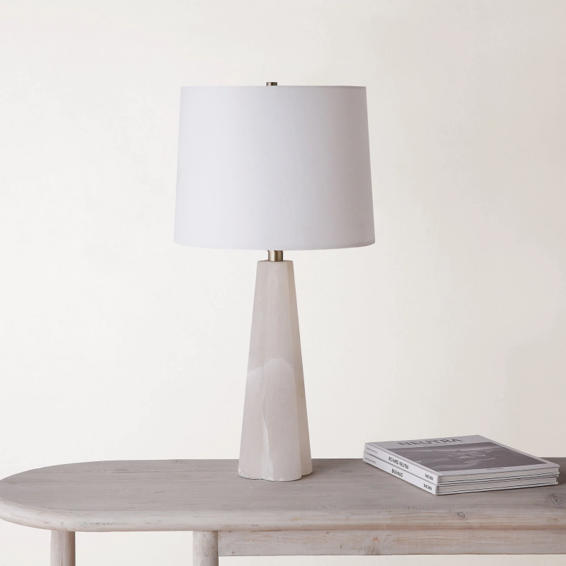A European flair fills the contemporary interior through this table lamp design. With a sleek and luxurious onyx body and a bright, off-white shade, this table lamp feels like a work of art in the living room interior. Clients will appreciate this dichotomy of this piece's cool quality during the day and warmth at night. Product Details:
