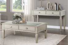 Radiating the iconic beauty of glamorous styling, the Juliette Collection is an elegant addition to your living room. The silver finish of the collection is reflected in the mirror trim that defines the profile of the cocktail table. The stylized legs that support the table lend subtle traditional accent while the decorative elements create a glamorous aesthetic. Storage drawers are conveniently located on the table’s apron with their embossed fronts featuring crystal-enhanced drawer knobs. Inset glass panels top the cocktail table, their presence serving to display the embossed and diamond patterned surface.