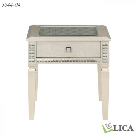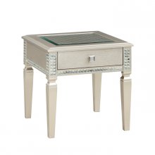Radiating the iconic beauty of glamorous styling, the Juliette Collection is an elegant addition to your living room. The silver finish of the collection is reflected in the mirror trim that defines the profile of the end table. The stylized legs that support the table lend subtle traditional accent while the decorative elements create a glamorous aesthetic. A storage drawer is conveniently located on the table’s apron with its embossed front featuring crystal-enhanced drawer knobs. An inset glass panel tops the end table, its presence serving to display the embossed and diamond patterned surface.