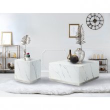 Your living room is certain to stand out and delight guests with the addition of the alluring Astraia occasional collection. This eye-catching small square coffee table makes a bold statement thanks to its unique solid cube design and exquisite faux marble finish. Pristine white is shot through with grey veining, accented by the contrasting brushed nickel finish of the metal base for an extra touch of glamour. A clear matte top coat adds a subtle luster and durability, protecting your table from stains and scratches and creating a surface that is easy to clean and maintain. Luckily your Astraia table isn't as heavy as it looks - hidden casters make it a cinch to roll the table out of the way whenever needed. Coordinating large square coffee table, rectangular coffee table, and end table also available. Also available in black marble and gold nickel finish.