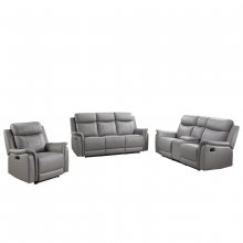 The classic look and evident comfort of the Cyrus reclining collection makes it a no-brainer for your contemporary living room. This sofa features a tab-pull latch mechanism to simply and effectively recline both ends independently, which is sure to please everyone in your household. Each seat is covered in authentic cowhide leather upholstery on every surface that touches your skin, while cost-effective high quality PVC-match fabric finishes off the sides and back, all in a handsome light grey colour. Stitch detailing offers subtle visual interest for a tailored appearance just as padded pillowy arms, generously stuffed headrests, and comfortable no-sag seat construction cradle your body supportively. The Cyrus truly is the perfect marriage of modern functionality and timeless style. Also available in black or grey leather/PVC-match. Also available as a power reclining sofa.