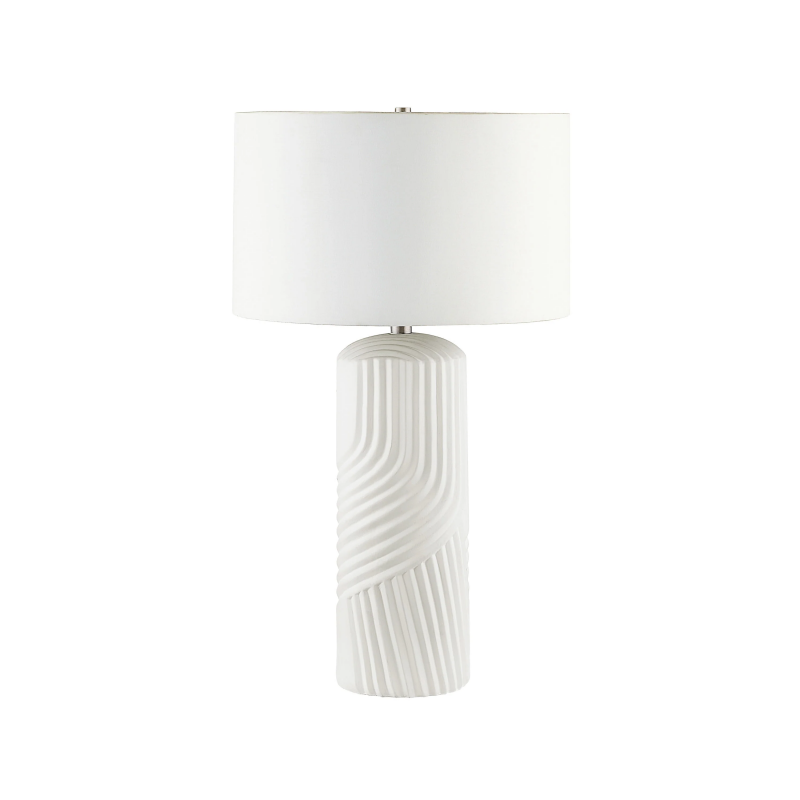 A textured ceramic structure lends complexity to the traditional table table lamp design in this piece. Subtle enough to blend into an interior yet unique enough to stand out, the choice is left to the homeowner for arrangement. All white in palette, with a touch of antique brushed brass, this table lamp brings a glowing quality to any room it's set within. Product Details:
