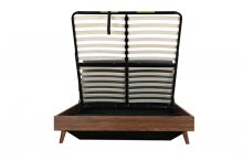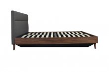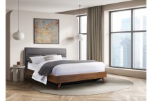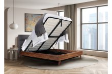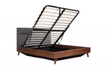 If you like a tidy and organized home, look no further than the Izzy bedroom collection. This stylish Full Bed has Mid-Century Modern inspired charm with its angled legs, low profile platform design, and two-tone mixed media appearance, but it also boasts some futuristic function thanks to a gas lift storage frame. This hydraulic storage system allows you to lift your entire mattress up, giving you total access to a spacious under-bed area perfect for storing larger items such as bed linens or bulky clothes. A neutral grey fabric upholstered headboard contrasted against a brown faux wood finish have universal appeal to look terrific in multiple bedroom settings, making the Izzy the natural choice for your contemporary bedroom.
