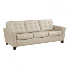 The retro-modern design that defines the Renzo Collection is a pairing perfect for your home’s living room. Beige top-grain leather covers the body of the sofa, everywhere the hand touches, with faux leather covering the remaining areas. Stitch tufting defines the seat surface and interior of the track-style arms, while the contoured rail framing lends visual accent to the face of the seats.