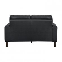 Modern comfort is paired with retro lines to create the design of the Lewes Collection. Covering the sofa, love seat, and chair is black 100% top grain leather where the body touches, while all other areas feature faux leather. Track arms and contoured seating lend to the versatile modern look. Supporting each piece in the collection are solid wood legs with a brown finish.