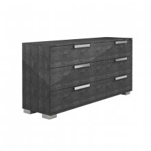 Understated luxury is the hallmark of the Sarah Modern 6-Piece Geo Upholstered Bedroom Set. Handcrafted in Italy, this opulent collection showcases a splendid grey faux birch wood grain beneath a high-gloss acrylic lacquer for a finish that is both lustrous and exceptionally durable. The bed's wide headboard is upholstered in an icy faux leather covering that is further embellished with a geometric-stitched design, adding contrast to the grey framing while presenting a modern façade. Moreover, the cleverly constructed base gives the bed an appealing floating effect. Coordinating case pieces stand atop chrome-finished feet with matching modern horizontal metal bar hardware; all drawers close gently and silently thanks to an ingenious soft-closing mechanism. Tailored for your busy lifestyle, the Sarah Modern is a beacon of calm that will allow you to build your dream bedroom.