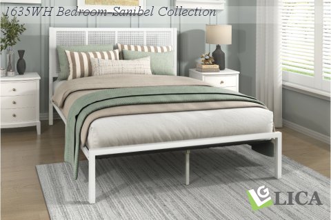 Lending a casual coastal vibe to your bedroom is the Sanibel Collection. The white finished metal bed features a framed faux cane panel headboard. Clean lines comprise the design of the bed, with the faux cane providing textural dimension to the headboard. The platform metal bed doesn’t require a box spring.