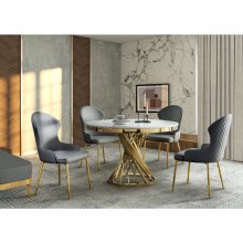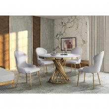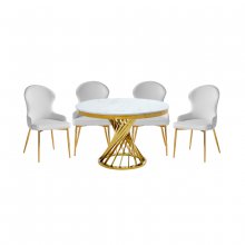 Modern glam meets renaissance royalty with the gold and marble accenting of the Venus Dining Set. This beautifully appointed collection is a work of art thanks to its sculptural profile and gorgeous finishes. Instead of a solid pedestal, the table’s base is comprised of numerous gold-finished metal bars that gleam as they gently spiral up to support the tabletop. The round dining surface showcases a realistic white faux marble finish, achieved by layering marble paper over genuine stone for a convincing tactile experience that combines the cool heft feel of true marble with a non-porous laminated surface that is easier to clean. Coordinating side chairs having matching gold legs and are upholstered in your choice of white or grey faux leather. The back and seat cushions are foam-padded for comfort with a beautiful contoured profile accented by diamond-quilted stitching. Imbued with depth and dynamism, the Venus is an enchanting addition to your contemporary dining room.