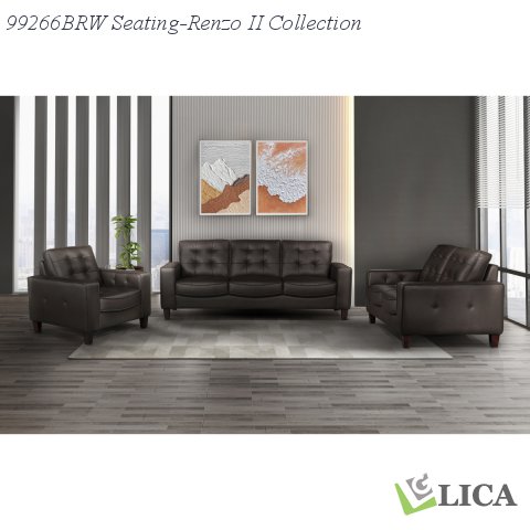 With its uplifting modern take on a retro design inspiration, the Renzo II Collection brings ample charm to your living room. Gorgeously attired in supple brown top-grain leather on its front and all areas that touch your skin and with high quality PVC faux leather-match on the back and sides, this 3-piece set exemplifies quality workmanship. Rounded edges soften the lines of the track arms and the exposed wooden legs, while biscuit tufting and flange seams enhance the collection's tailored appearance. Crafted to playfully walk the line between vintage and contemporary, the Renzo II offers the best of both worlds to suit every taste.