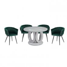 Introduce a little artistry to your dining room with the exquisitely rendered Skye Collection. This stylish arm chair is a fantastic way to spruce up your modern dining area thanks to its contemporary low profile. The barrel design is cloaked in soft green velvet upholstery that weaves around the frame with a unique braided effect. Despite its artistic appearance, the contoured back and arms are padded with foam, as is the seat, providing ample cushioning and support. Metal framing and angled black powder-coated metal legs guarantee long-lasting durability, allowing the Skye to effortlessly blend practicality and elegance as it becomes your dining room’s new statement piece. Other colours also available.
