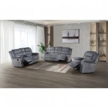 Get ready to snuggle up in style with the Tyrone 3-piece Reclining Set! This charming collection is the perfect addition to any cozy living space thanks to generously stuffed headrests and plush pillow armrests that invite you to relax and unwind in comfort. With an easy-to-use tab-pull latch mechanism, reclining is effortless – just pull, lean back, and enjoy the ride! The loveseat is particularly convenient thanks to a central console with storage and two cupholders so you can enjoy drinks anytime, plus the recliner has a gliding mechanism for gentle motion. Upholstered in extra soft velvet-like grey fabric with a corduroy pattern on the fronts and just a hint of a sheen, this collection brings a touch of retro cozy charm to your home. Plus, with durable framing under dense foam seat construction, this set is built to last. Allow the Tyrone to transform your living room into a relaxing haven and treat yourself to a blissful lounging experience.