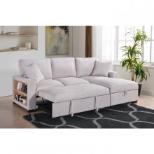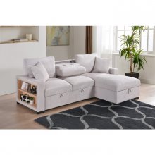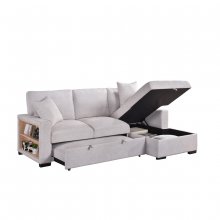 Experience a new paradigm of functionality with the stylish Pallas Collection. This 2-piece sofa sectional was designed to elevate your living space with features that are both posh and practical. Upholstered in beige fabric for a timeless look, its clean modern design has crisp edges that add a touch of sophistication to your living room. The right side chaise offers hidden storage, perfect for keeping your space clutter-free, while the loveseat boasts a hidden bed that effortlessly pulls out and pops up so that you can accommodate overnight guests in style. The square track arms not only enhance the contemporary appeal but also feature open shelves for books or devices, seamlessly blending form and function. The loveseat's central back cushion also drops down to reveal a table with two cupholders, making movie nights or entertaining easier than ever. Beautifully crafted for all your needs, the Pallas is the ideal indulgence for your living room thanks to a perfect harmony of style and practicality.