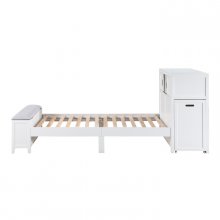 Maximize your child's bedroom space with this multifunctional white bookcase bed, designed for both style and practicality. Crafted from wood and engineered wood with a sleek white finish, this bed features a bookcase headboard with a hidden desk and foam-cushioned stool, perfect for study or creative activities. The footboard includes a convenient storage bench, while the headboard offers three dovetail drawers with smooth ball-bearing glides for organized storage. Polished nickel-tone flush ring pulls add a touch of sophistication, and the design eliminates the need for a foundation or box spring, making it a space-saving and efficient choice for any bedroom.