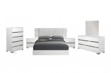 Your bedroom will feel like a sophisticated haven with the Dream 6-piece Upholstered Geo Bedroom Set's understated elegance. Making use of modern Italian design principles, this stately bed uses sleek lines and a minimalist profile to create uncluttered serenity in your contemporary bedroom. Glossy acrylic lacquer protects a shining white finish accented with polished chrome, all of which promotes a sensation of openness and brightness in your bedroom. The center of the extra-wide headboard is upholstered in an icy faux leather covering that is further embellished with a geometric-stitched design, creating an expansive, visually impactful surface. The accompanying case pieces are unmarked by any hardware for a clean and trim appearance, and the soft-closing mechanism further serves to emphasize the efficient, no-nonsense design. Aptly named, the Dream Bedroom is a collection for those who dream of minimalist luxury.