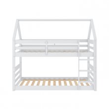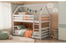 Turn bedtime into an adventure with the Bloom Collection! With its whimsical house-inspired frame, this twin over twin bunk bed brings a playful touch to any child's room. Whether you leave the roof open to spark imagination or drape a blanket over it to create a private “attic,” the stylish and clean design creates endless possibilities. Great for siblings or sleepovers, the twin footprint gives each child their own comfy spot without taking up extra floor space. The top bunk is protected by horizontal slatted guardrails, while the lower bed sits at ground level, easily allowing little ones to climb in and out safely. A sturdy ladder makes getting to the top a breeze, and the reversible design allows it to be assembled on either side of the bed depending on your preference. Durably constructed from solid pine and engineered wood, the pristine white painted finish has a timeless contemporary look. Between sleepy weekend mornings or giggly sleepovers, the Bloom is the perfect place for memories to unfold.