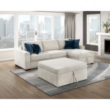 Elevate your living space with the adaptable and comfortable 3-piece sectional with storage ottoman. Upholstered in a soft and durable textured microfiber, this stylish set includes a versatile 2-seater, a relaxing chaise, and a functional storage ottoman, allowing you to create the perfect configuration for your room. The chaise features convenient hidden storage and a drop-down back, while the rolling storage ottoman provides extra space for blankets, pillows, or media accessories, keeping your living area tidy. Built with a sturdy plywood frame and supported by elegant espresso-finished solid wood feet, this sectional is designed for lasting quality and style. Complete with four coordinating décor pillows and featuring reversible back and attached seat cushions, the sectional offers both comfort and customizable appeal.