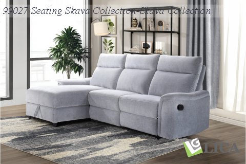 The Skava Collection unites contemporary design with modern comfort, creating the perfect seating arrangement for your living room. This refined sofa-chaise doubles down on style with a chic profile paired with airy grey chenille upholstery that serves as the ideal canvas for your decorative preferences. While the left side chaise is a great option for stretching out, the right side arm chair extends as well thanks to the tab-pull latch reclining mechanism. That is not the only convenient feature; the chaise also features a lift-top storage compartment that provides extra space, helping to keep clutter to a minimum. The cushioned track arms and tailored accent stitching are just icing on the cake of comfortably supportive seating. Effortlessly suave and inherently multi-functional, the Skava seamlessly combines flexibility and style to complement your modern lifestyle. Reverse configuration also available.