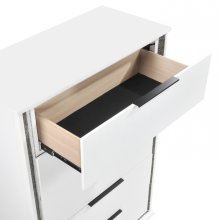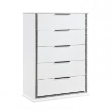 Enhance your bedroom with the perfect blend of contemporary style and functional storage in this stunning white 5-drawer chest. Designed for modern luxury, it features a crisp white finish beautifully contrasted by metallic silver-gray trim and sleek black-tone edge pulls. The integrated LED lighting system provides eight customizable color options to set any mood via the included controller. Crafted from sturdy wood and arriving fully assembled, this high-end vertical chest offers a seamless upgrade to your home.