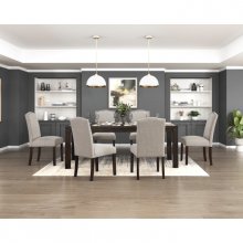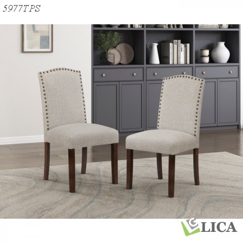 Elevate your dining experience with this sophisticated upholstered side chair, a perfect blend of classic charm and modern durability. Built on a wood frame, the legs feature a distinctive wire-brushed brown finish that adds rustic character and warmth to the piece. The chair is wrapped in premium textured fabric upholstery, offering both soft comfort and visual depth that hides wear well. Accented with metallic nailhead trim tracing the silhouette, this parsons-style seat adds a touch of refined luxury to any dining table. Whether for formal dinners or casual family meals, this sturdy seating option ensures style and support for every occasion.