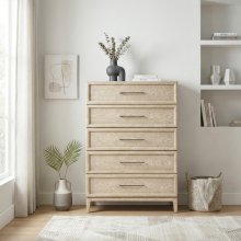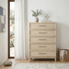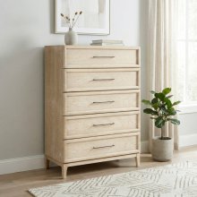 Optimize your bedroom layout and elevate your decor with this sophisticated 5-drawer chest, a vertical storage solution designed for modern living. Expertly constructed from a durable blend of wood and engineered wood, this tall dresser is surfaced with a genuine oak veneer that showcases the intricate, natural wood grain in a soft light brown hue. The aesthetic is clean and organic, making it a seamless fit for coastal, farmhouse, or Scandinavian-inspired interiors. Functionality is at the forefront of the design, featuring five spacious drawers built with robust dovetail joinery and smooth ball-bearing glides for effortless daily access. Finished with sleek black nickel-tone bar pulls, this chest offers a perfect balance of rustic warmth and contemporary industrial flair.