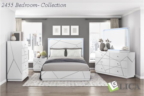 Elevate your bedroom's aesthetic with this stunning, modern white collection, blending high-style design with contemporary functionality. The centerpiece is a sleek panel bed (available in queen, eastern king, or california king), featuring distinctive etched geometric line accents and integrated LED lighting in the headboard for ambient illumination. Complementing the bed are matching case goods—including the nightstand, 6-drawer dresser, 5-drawer chest, and illuminated mirror—all crafted from durable wood and engineered wood in a crisp white finish. Storage is maximized through spacious drawers that operate smoothly on ball-bearing glides and are accented with sleek chrome-tone knobs, ensuring this collection provides a luxurious, organized, and high-tech modern retreat.
