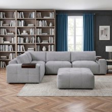 Elevate your living room with this versatile 5-piece modular sectional, designed for ultimate customization and contemporary style. Wrapped in premium gray textured fabric with elegant tufting details, this expansive set includes a left-arm chair, armless chair, corner seat, right-arm chair, and a mobile ottoman. Featuring back and seat cushions with a luxurious down-blend topper over high-density foam and integrated wooden armrest trays, this sectional provides luxurious comfort and functional convenience, making it the perfect centerpiece for modern family gatherings.