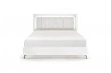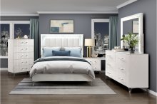 Revitalize your bedroom with this glamorous, contemporary collection, anchored by a striking white finish. The chenille upholstered headboard and mirror feature integrated LED lighting and elegant faux marble laminated panels. The case goods boast sleek faux marble tops, while drawers operate smoothly on reliable ball-bearing glides. Dazzling nickel-tone bar pulls with acrylic accents and chrome metal legs complete this high-end, stylish, and comfortable design.