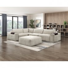 Elevate your living room with this versatile 5-piece modular sectional, designed for ultimate customization and contemporary style. Wrapped in premium taupe textured fabric with elegant tufting details, this expansive set includes a left-arm chair, armless chair, corner seat, right-arm chair, and a mobile ottoman. Featuring high-density foam cushions and integrated wooden armrest trays, this sectional provides luxurious comfort and functional convenience, making it the perfect centerpiece for modern family gatherings.