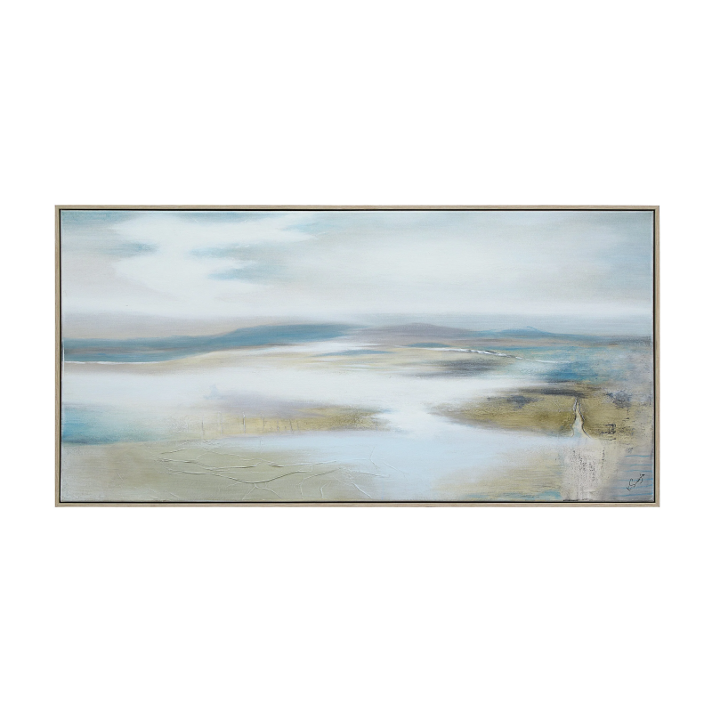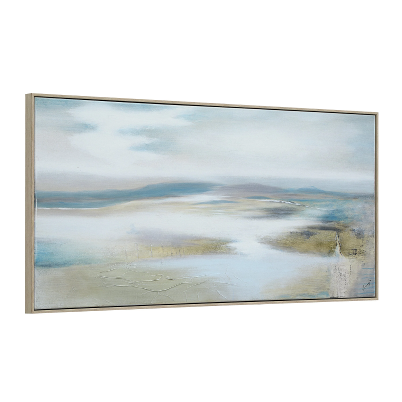 Set a serene, contemplative mood with the Marbleau landscape canvas art. Hand-painted with layered gel and paper accents, its texture and matte finish invites quiet reflection. Framed in soft cream, this timeless piece balances light and depth, adding effortless elegance and calming style to any room. Product Details: