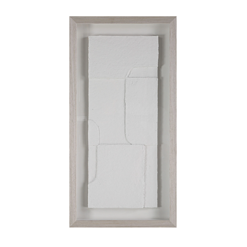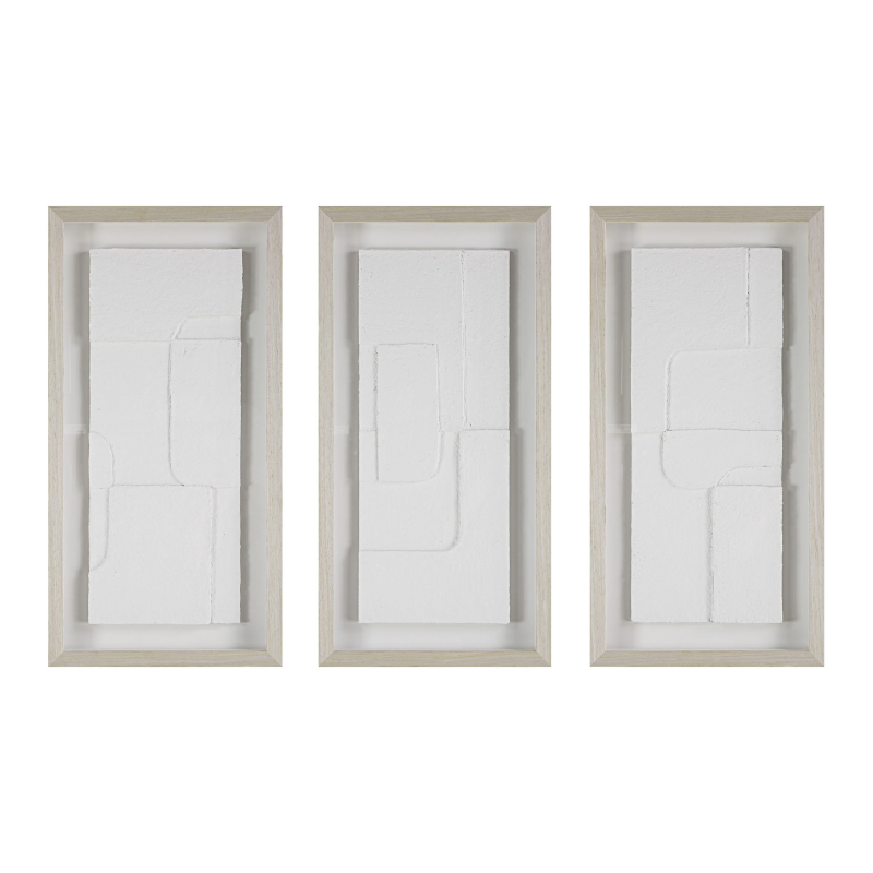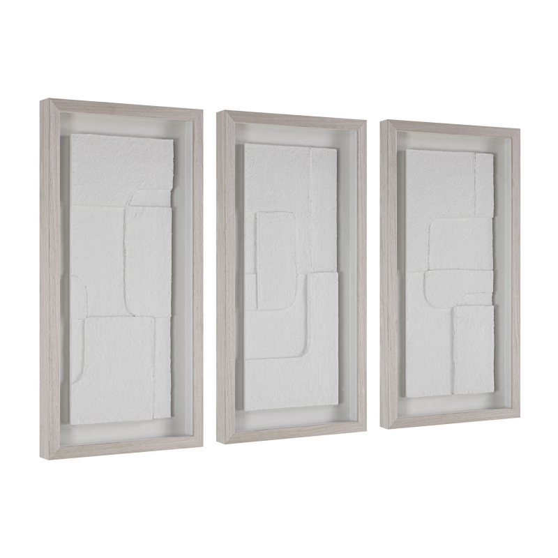 Triple up on neutral-hued texture with this trio of modern wall art. Designed using a papier mache technique, each multidimensional piece is mounted with a floating effect under glass and surrounded by a light walnut frame for a contemporary look and feel in any interior. Display them horizontally or vertically for showstopping style. Product Details: