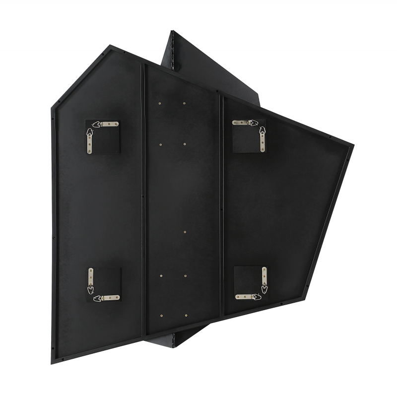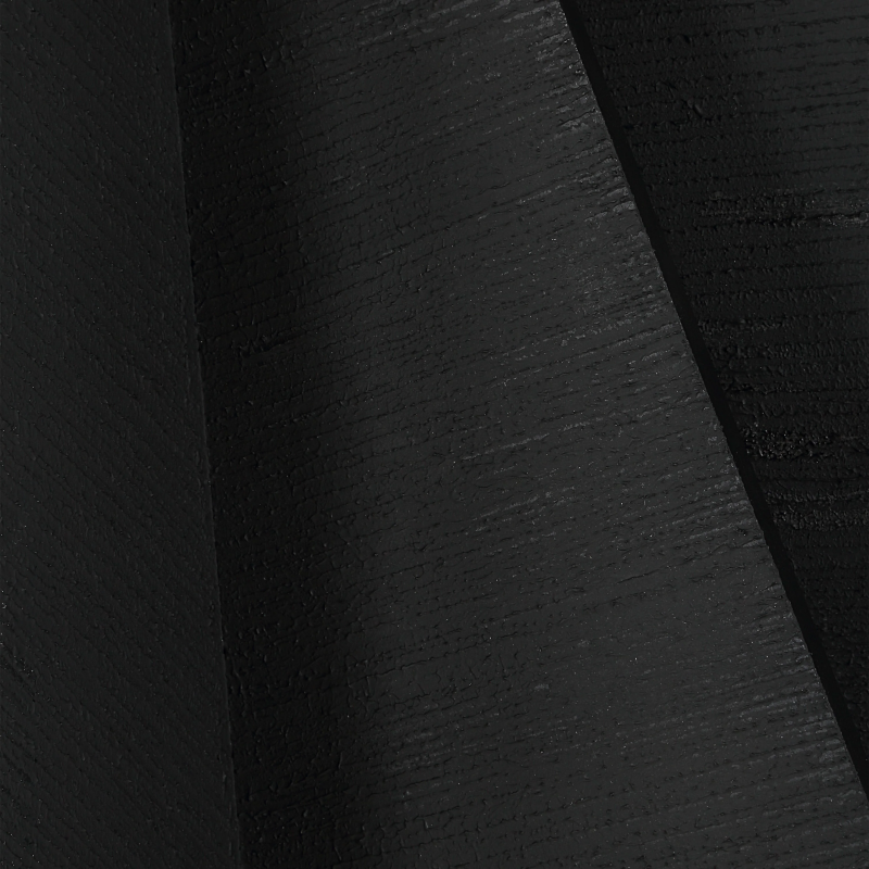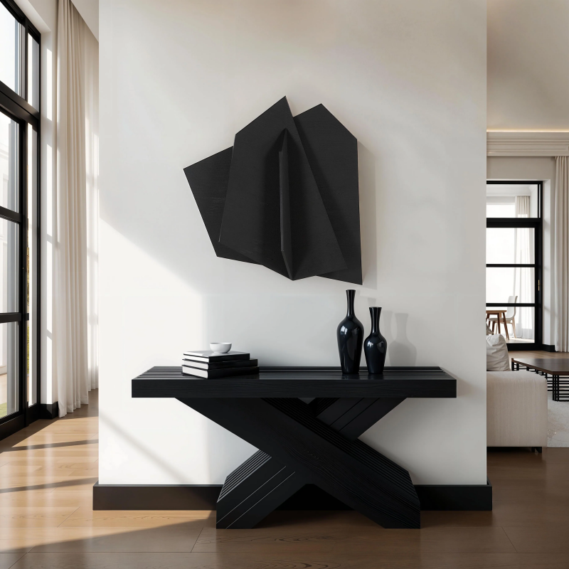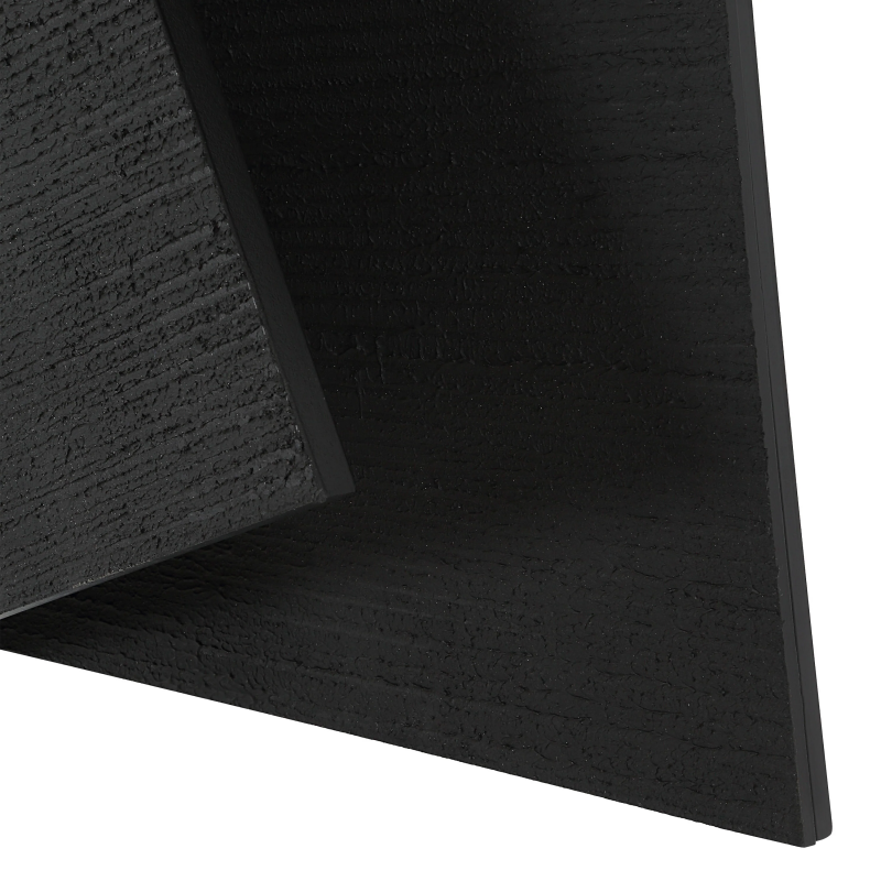 Embrace moody style in your design project with this abstract sculptural wall art. Composed of carved shapes, this large-scale piece features a matte black finish applied with a combed gel and sand technique for a dark and dramatic result. 4-way hanging allows for a multitude of display options to maximize the impact in any room. Product Details: