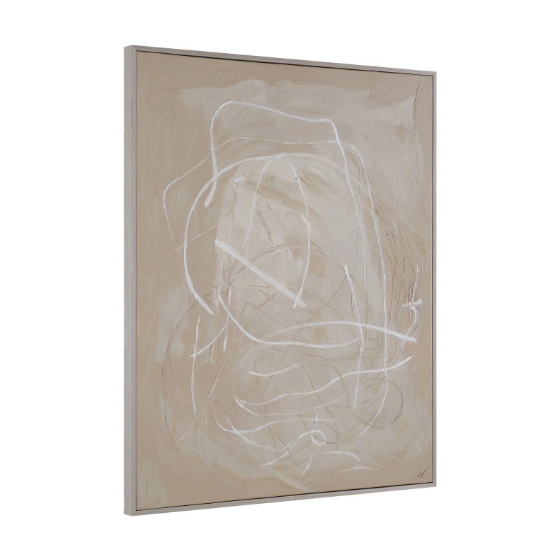 Introduce a calm vibe into your next design project with this neutral abstract art. Hand painted on high-quality canvas, its free-spirited brushstrokes come to life in texture and shadow to set a tone that's modern and timeless. Framed in light oak with a flush mount, the effect is minimalist yet memorable. Product Details: